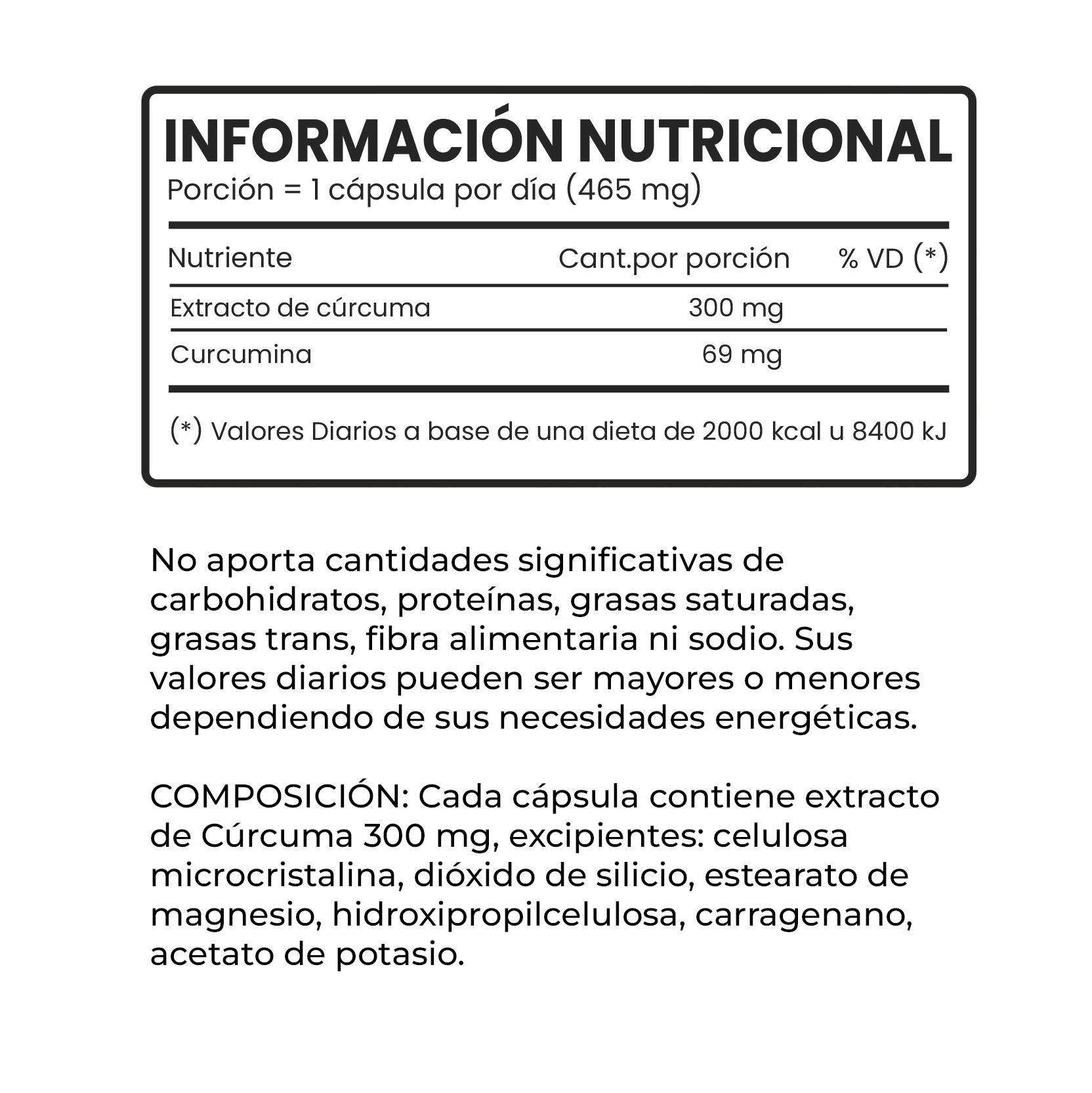 Cada cápsula contiene extracto de Cúrcuma 300 mg, excipientes: celulosa microcristalina, dióxido de silicio, estearato de magnesio, hidroxipropilcelulosa, carragenano, acetato de potasio.